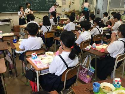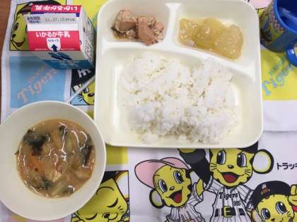 配膳中には、教室に「遠き山に日は落ちて」「燃えろよ燃えろ」「今日の日はさようなら」の歌が流されています。