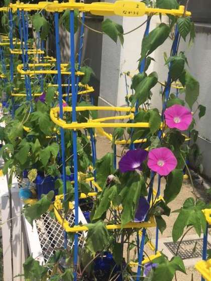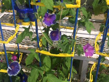 2年生が育てているアサガオが大きな花を咲かせ始めました。