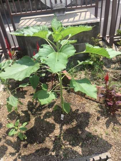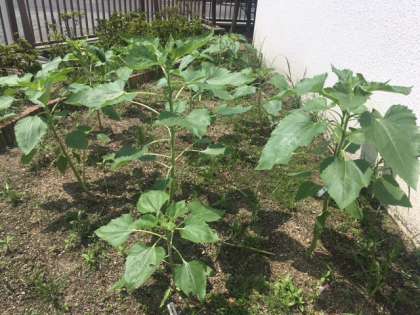 種から育てて、学校の南東角に植え替えてから1ヶ月。梅雨の雨を栄養にして、どんどん成長しています。