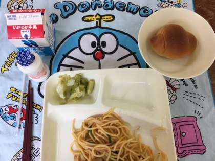 今日の給食献立は、黒糖パン(2分の1)、チキントマトスパゲッティ・グリーンアスパラガスとキャベツのサラダ・発酵乳・牛乳です。