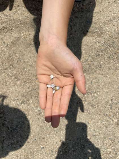 砂にまじって小さな貝がらがいくつも見つかりました。