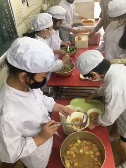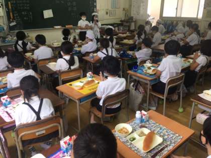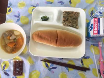 今日の給食献立は、コッペパン・もずく入りヒラヤーチー・豚肉と厚揚げの煮物・あっさりきゅうり・いちごジャム・牛乳です。