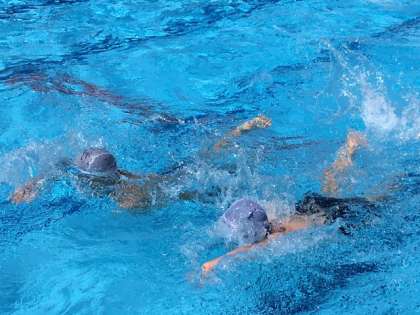 準備体操を済ませてから、いきなり泳がずに色んなことをします。バディとジャンケンをして、負けたら水中で3回転。バディとは、その時間にお互いに助け合ったり、体調に気をつけたりする仲間のことです。