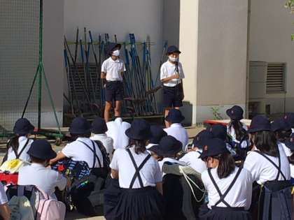 みんな、ちゃんと時間通りに集合できました。まず運動場で出発式です。林間学習実行委員会のメンバーが司会進行してくれます。実行委員会は8人ですが、6月に委員を決める時には30人近くが立候補してくれました。ジャンケンで決めたのですが、この学年の積極性と仲の良さが伺えますね!