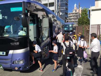 今日から5年生の林間学習です。夏日の超快晴に恵まれました。