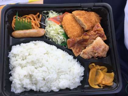 今日のお弁当の中身は、ごはん・鶏の照り焼き・魚フライ・ソーセージ・スパゲッティ・キャベツ・つぼ漬けです。