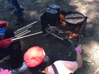 火を起こして、飯ごうとカレーの鍋を火にかけました。