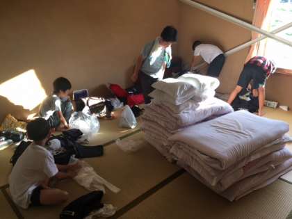 写真は、片付け・宿舎玄関から鉢伏山を望む・張り出されている予定表の確認の様子です。