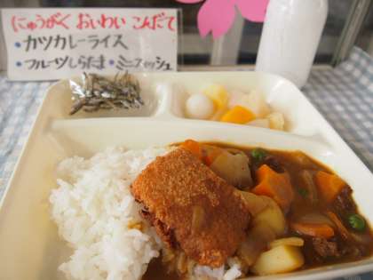 カツカレーライス、フルーツ白玉、ミニフィッシュ、牛乳