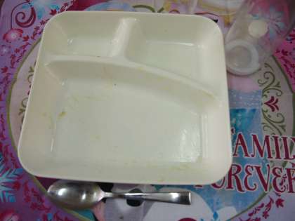1年生は初めての給食でした。こんなにきれいに食べた子がいました。