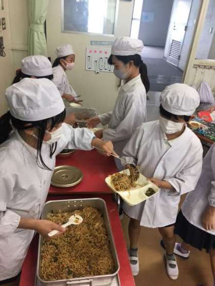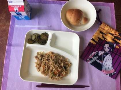 今日の給食献立は、黒糖パン・オイスター焼そば・きゅうりの中華和え・牛乳です。