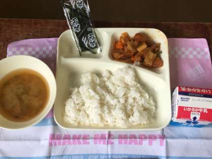 今日の給食献立は、ごはん・酢豚・焼きのり・中華みそスープ・牛乳です。