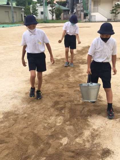 今日の運動委員会は、ちょうど山土が入ったので大雨で削られた運動場を整備してくれました。