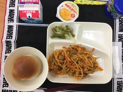 今日の給食献立は、黒糖パン(二分の一)・イタリアンスパゲッティ・グリーンアスパラガスとキャベツのサラダ・みかんゼリー・牛乳です。