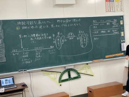 めあては、「目的にあった選び方、買い方ができるようになろう」です。持続可能な暮らしのために物やお金の使い方を考えました。