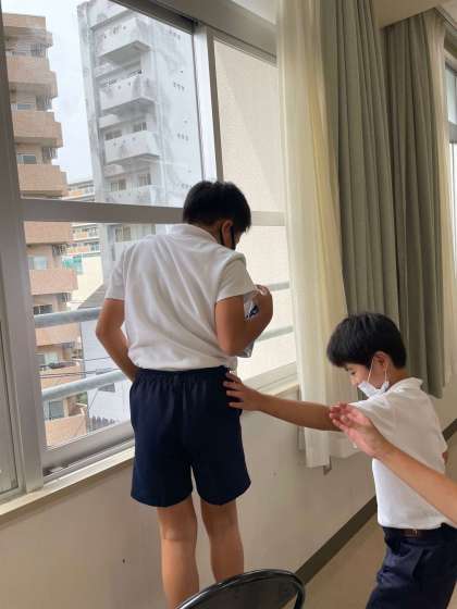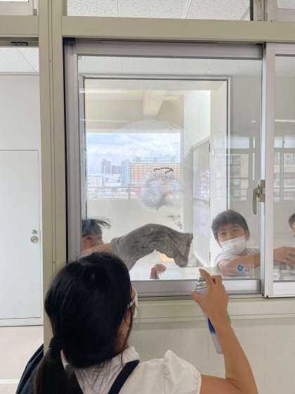 ご褒美にガラスクリーナーを手渡しいざ掃除開始です。協力し合ってどんどん拭いていきます。美しくなっていきます。きれいになると自然と笑顔がふくらみます。あっという間に掃除の時間が過ぎ去っていきました。掃除が終わったお子たちの顔には誇らしくかつ明日も頑張るぞという気持ちが表れていました。