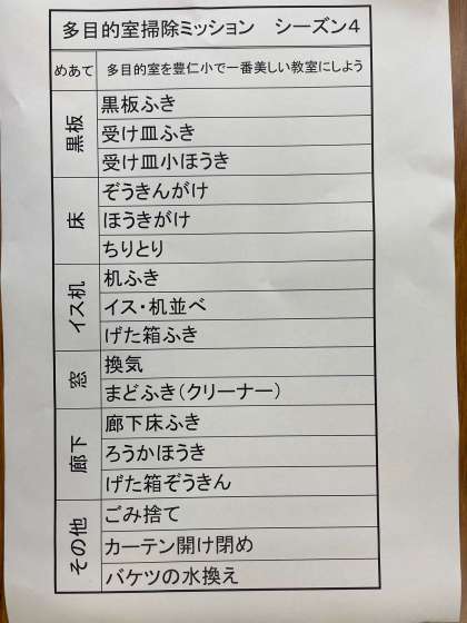 今回のグループでシーズン4になります。「多目的室を豊仁小で一番美しい教室にしよう」を合言葉に頑張っています。初日には多目的室でどのような掃除ができるかを話し合います。10の方法で合格となるのですが今回のグループは17の方法を見つけ出しました。たいしたものです。