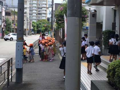 学校のそばまで戻ってくると、体育館で体育をしていた1年生を見つけて、2年生の子どもたちが手を振ります。