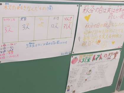 「私の好きな秋の果物」の内容は、3年生にアンケートをとって調査した結果を発表しています。1位は断トツでリンゴです。少し離されて梨と柿が続きます。少数派ですが文旦とラ・フランスが3票ずつ入りました。