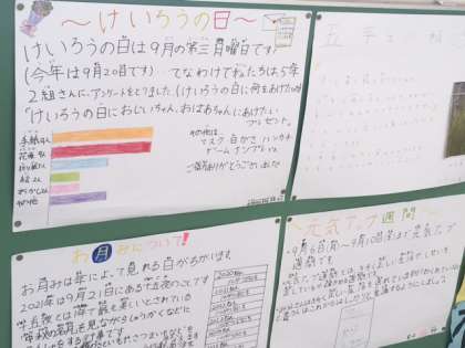「敬老の日」の記事は、「敬老の日におじいちゃん・おばあちゃんにあげたいプレゼントは?」というアンケートを5年生にとりました。