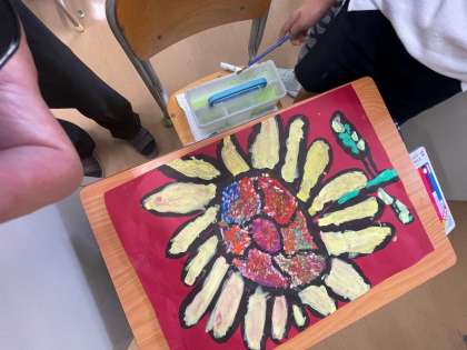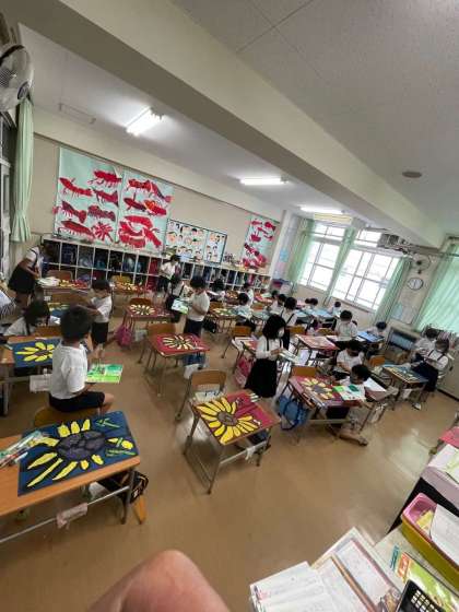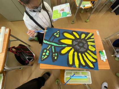 図工の学習の時間です。ヒマワリを画きました。花びらや茎は黒でしっかりと輪郭を描き、その中に濃い目の原色の水彩絵の具を流しこみます。種子の部分は、たくさんの色を詰め込みサイケデリックに仕上げます。個性豊かなアートに仕上がりました。優しさがにじめでていたり、元気いっぱいだったり、色彩の豊かさがでていたり、繊細さがにじみ出当ていたり、独創性を感じさせてくれていたり、リトルゴッホやジュニアピカソの誕生です。