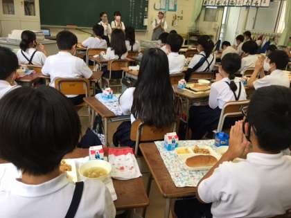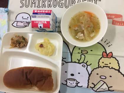 今日の給食献立は、黒糖パン・豚肉と野菜のケチャップソテー・野菜スープ・スイートポテト・牛乳です。