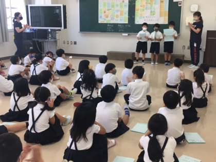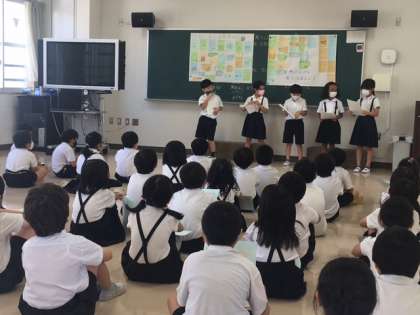 班ごとに見聞きしてきたことを発表しました。恥ずかしいのか、少し声が小さいのが残念でしたが、聞いてきたことをしっかりと発表できていました。