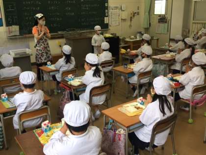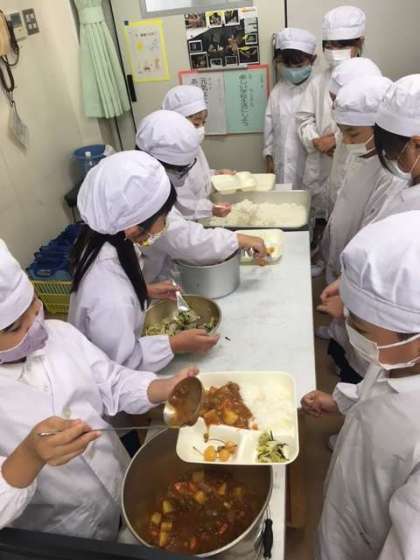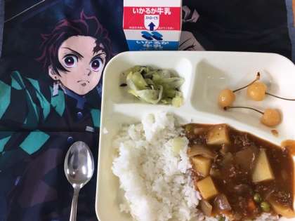 今日の給食献立は、ハヤシライス(米粉)・キャベツのひじきドレッシング・さくらんぼ(缶詰)・牛乳です。