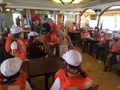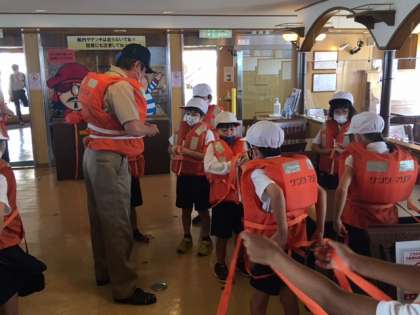乗船後、まず、救命胴衣の付け方を教わります。その後、船長さんがサンタマリア号についての説明をしてくださいました。
