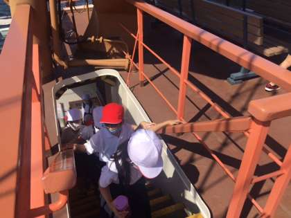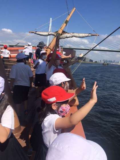 子どもたちは、陸にいる他校の子どもたちに手を振り続けます。向こうもみんな手を振ります。