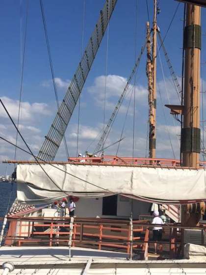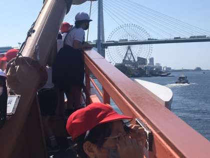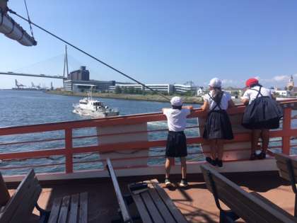 サンタマリア号は、大阪港をゆっくりと周っていきます。子どもたちは、それぞれいろんなところに動きながら、いろんな景色を楽しんでいます。