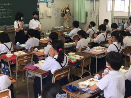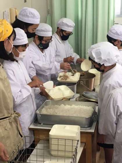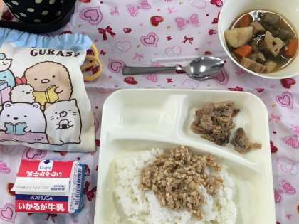 今日の給食献立は、ごはん・豚肉のネギ醤油焼き・ふきよせ煮・ツナ大豆そぼろ・牛乳です。