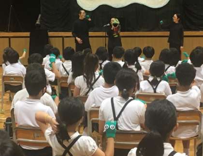 劇の終了後には、劇団の方が手袋を全員にプレゼントしてくれて、人形劇のコツを教えてくれました。