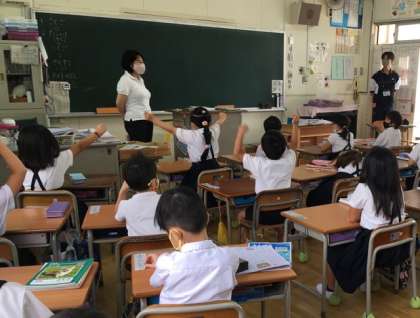 今日は1年生の教室で挨拶をしました。担任の先生が、「休み時間も遊んでもらえますよ〜」と言うと、「わ〜い!」と歓声が上がりました。「先生、かっこいい〜」という女子の声も。