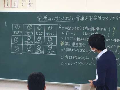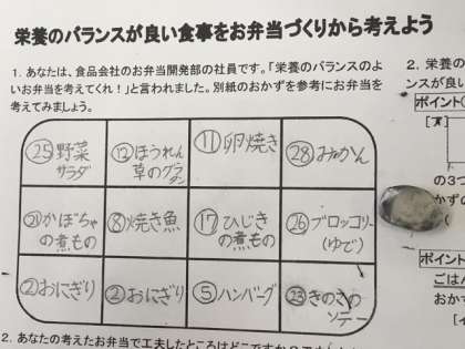 写真の標題のように「お弁当づくり」から考えます。まず、子どもたちそれぞれが、栄養バランスのいいと思うお弁当をプリント上で作ってみました。ネーミングもして、人気投票をしてみると、「毎日、遠足気分!」というお弁当が圧倒的な人気を得ました。