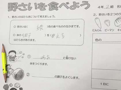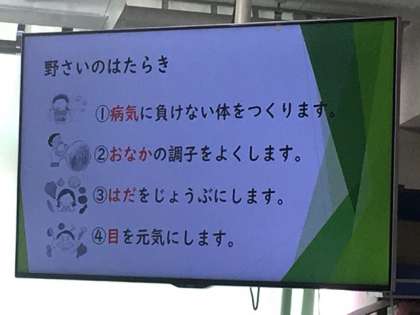 4年生では、野菜の大切さについて教えてもらいました。野菜をとることでコロナにも負けない身体にしましょうと、野菜の利点をたくさん教えていただきました。