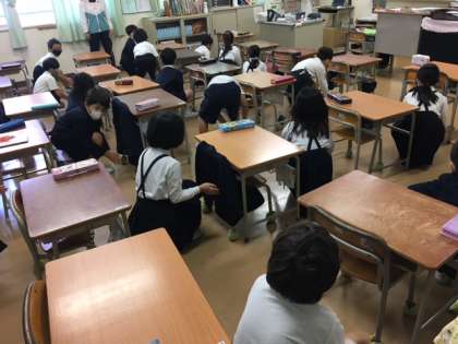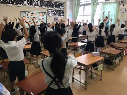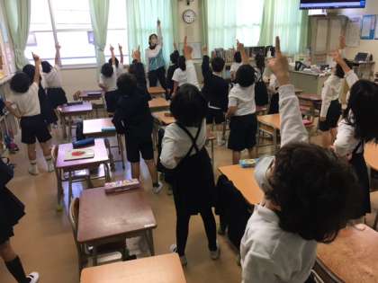 1時間めの授業が始まる前、軽快な音楽が流れているので見に行くと、2年生でスポーツデーの演技の練習をしていました。