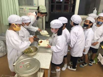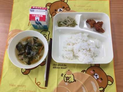 今日の給食献立は、ごはん・まぐろのオーロラ煮・もやしとピーマンの炒めもの・すまし汁・牛乳です。