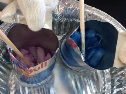 ロウを溶かして色をつけ、2色のロウから、ロウソクを作ります。やけどしないように、ロウを溶かすのに時間がかかりましたが、最後はきれいなキャンドルが出来あがりました。
