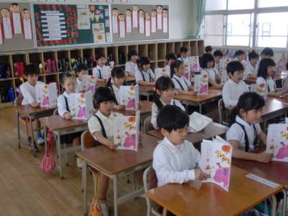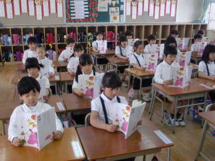 よい姿勢で、両手で教科書を持って、大きな声で読んでいます。