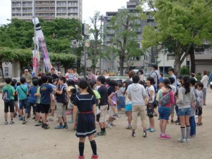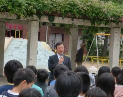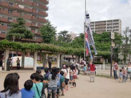 まず、本校の前の長柄公園でこいのぼりを上げました。みんなで力を合わせて綱を引きました。「オーエス!」 うん?その掛け声は違うでしょう。