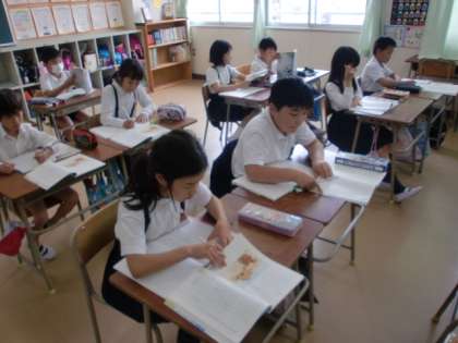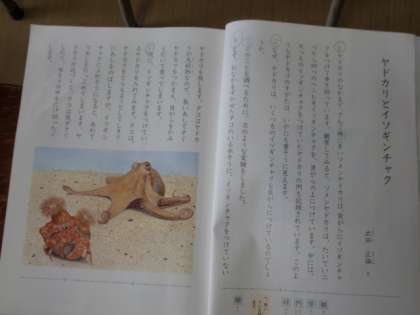 説明文「ヤドカリとイソギンチャク」を文の構成から、始め、中、終わりの3つに分ける学習をしました。一から十二の形式段落のどこまでが始めで、どこからどこまでが中で、どこからが終わりか、それぞれのノートに自分の考えを書きました。