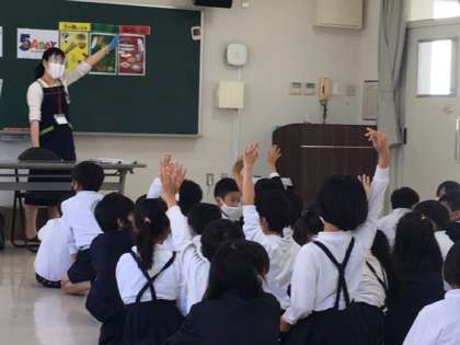 3年生の取組で、スーパーマーケット ライフの方に来ていただいてお話をしていただきました。まず、「どんな質問でもいいですよ〜」の質問タイムでは、子どもたちからどんどん質問が出ました。