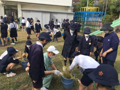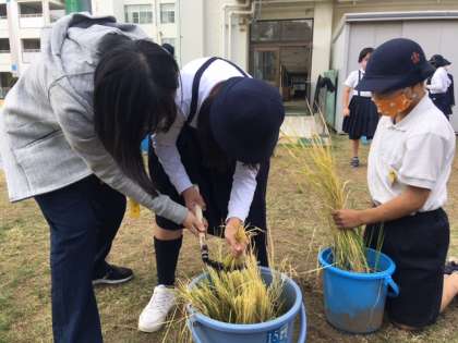 今日は5年生が育ててきた「バケツ稲」の収穫です。