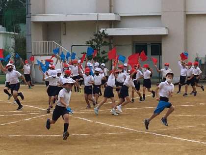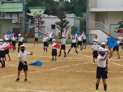 一振り一振りが素早くなってきました。秋空に、赤と青の旗がとてもきれいです。隊列が動くところは壮観です。