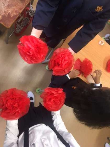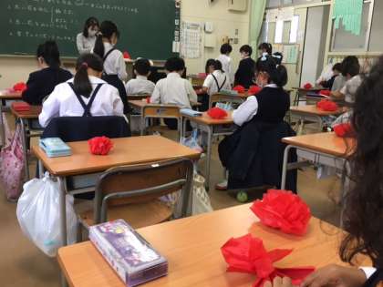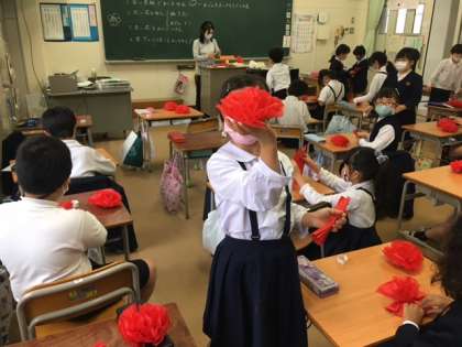 2年生の教室。みんな、きれいな花を一生懸命作っています。