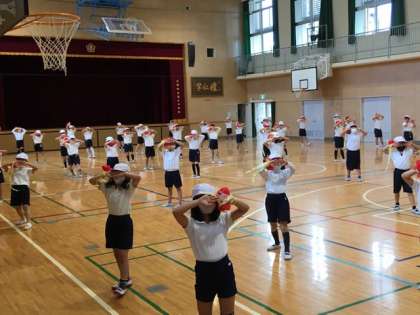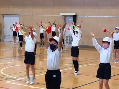 今日は、運動場が濡れていて使えないので、体育館で、昨日作成した紅蓮華を腕につけての練習をしました。