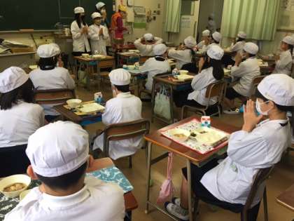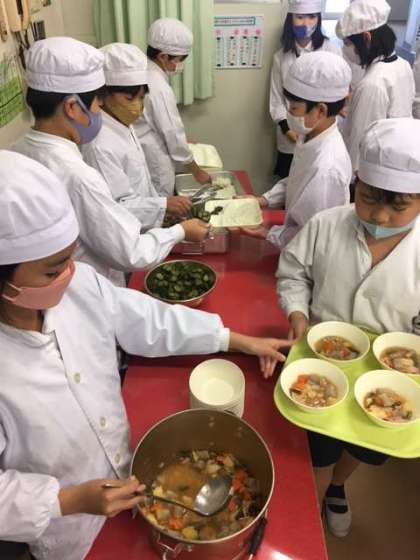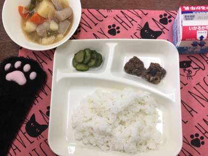 今日の給食献立は、ご飯・くじらの竜田揚げ・豚肉ととじゃがいもの煮物・きゅうりの赤紫蘇和え・牛乳です。