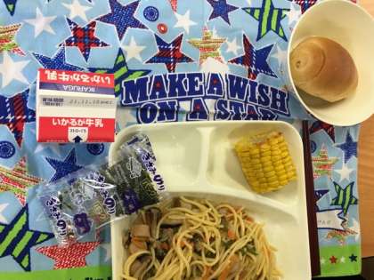 今日の給食献立は、黒糖パン(2分の1)・ウインナーときのこの和風スパゲティ・焼きとうもろこし・固形チーズ・牛乳です。