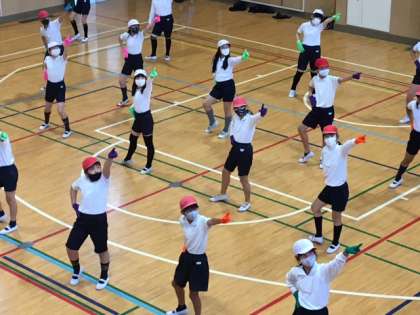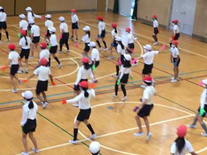 今日も雨水で運動場が使えません。午後の5年生のスポーツデー団体演技の練習は体育館で行いました。